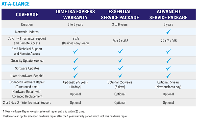 DIMETRA EXPRESS WARRANTY. DIMETRA Express is supplied as standard with a 3 year warranty providing software and security updates plus technical support. Hardware repair for one year is also included as standard with an option to extend cover to 3 years.